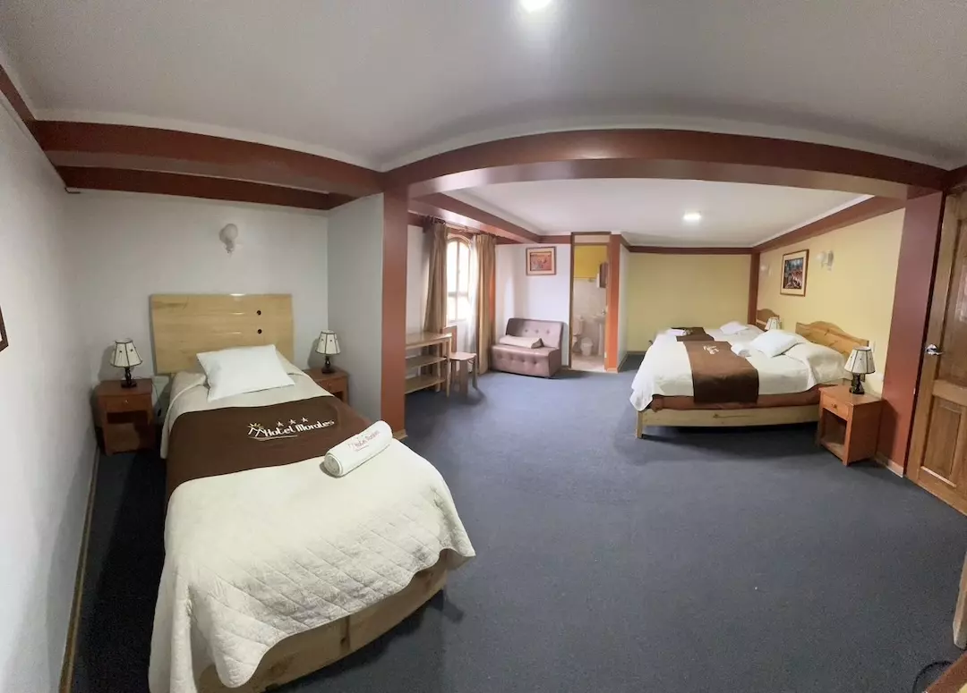 The triple room of 30 m2 overlooking the garden, with large beds of 190 cm 3, is equipped with cable TV, desk and closet to make you feel at home. It includes private bathroom with shower and hot water 24 hours.